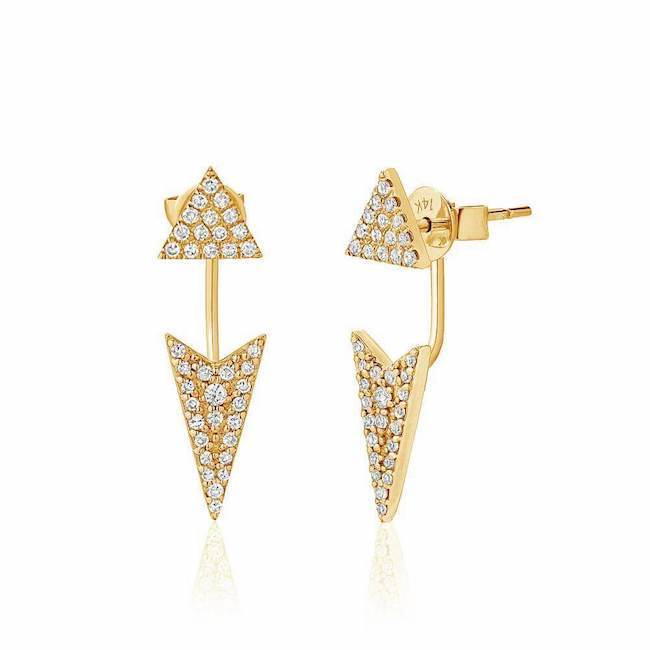 These 14k gold diamond studded earrings feature an arrowhead suspended on a wire from the backing, to create a stylish statement.