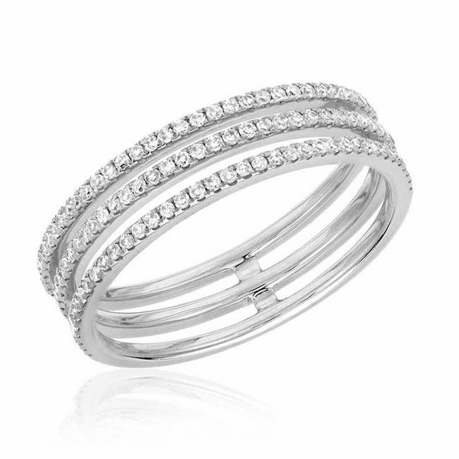 This 14k gold ring has sparkling halfway rows of diamonds on three bands.