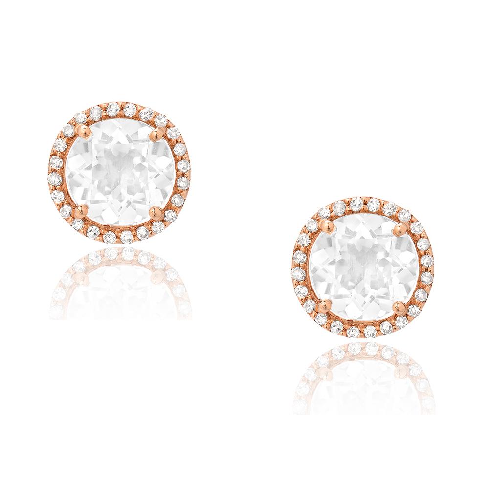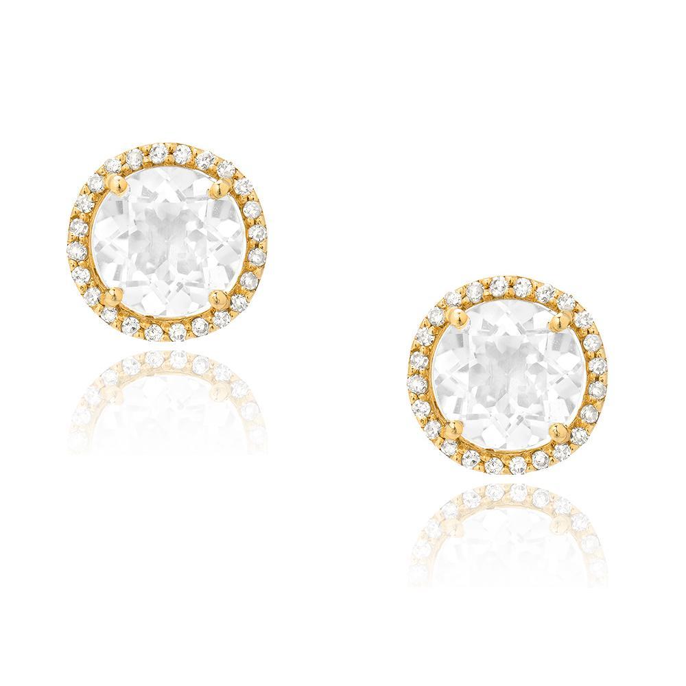 These elegant white topaz earrings are haloed with white diamonds and set in 14k gold. A beautiful statement in a classic style.