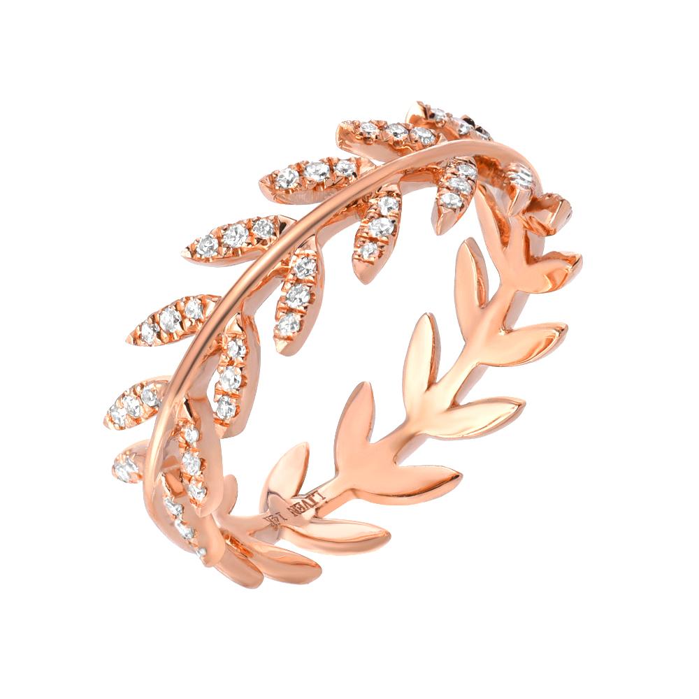 This beautiful band features a wreath motif and is halfway set with diamonds. An elegant ring for stacking or wearing alone.