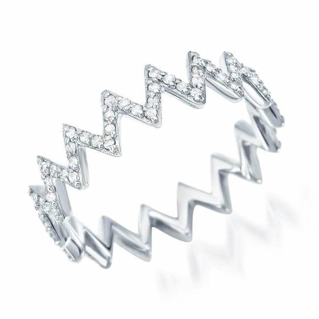 This 14k gold halfway diamond studded ring features a zigzag pattern that fits like a puzzle piece when multiple zigzag rings are stacked together.